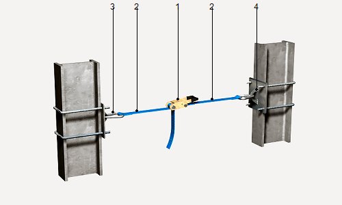 Ligne d'ancrage horizontale temporaire, de sangle en polyester, fixée au support métallique