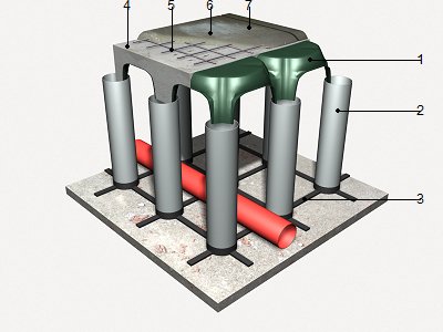 Coffrage perdu avec pièces en polypropylène recyclé, de 58x58x15 cm, à disposer sur des tubes en PVC, sur une matrice de base, pour planchers surélévés grande hauteur sur vide sanitaire.
