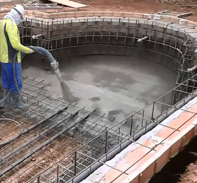 Béton BCN: CPJ-CEM II/A 32,5 - TP - B 30 - 15/25 - E: 2a - BA - P 18-305, projeté par voie mouillée pour la réalisation du parement horizontal du bassin de piscine, de 15 cm d'épaisseur, avec double treillis soudé 100x100 mm et Ø 4,0-4,0 mm, en acier Fe E 500, et armature de renfort d'acier Fe E 500, quantité 4 kg/m³, sans joints de dilatation. Comprend le fil de fer à lier et les séparateurs.