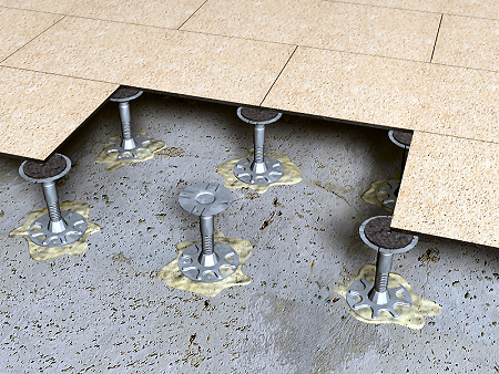 Impression de la surface de base. Implantation des axes des plots et marquage des niveaux. Mise en place, nivellement et fixation des plots. Mise en place des plaques. Impression de la surface de finition.