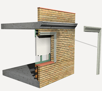 Habillage d'une baie de façade, préfabriqué en béton, couleur à choisir, en pièces de 80x30 mm, avec ancrage métallique en acier inoxydable sur sa face inférieure.
