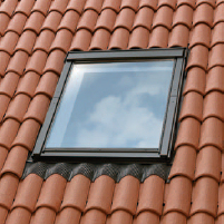 Cadre d'étanchéité en aluminium pour fenêtre de toit, modèle EDW CK01 0000 "VELUX", de 55x70 cm, couleur grise, pour toit de profil ondulé en tuile, en fibrociment ou en matériaux similaires avec pente supérieure à 15°, précadre isolant BDX 0000 et membrane imperméable périmétrique BFX 1000.