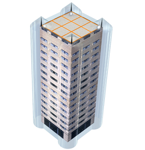 Système externe de protection contre la foudre, constitué d'un paratonnerre de type maille conductrice (Cage de Faraday), avec réticule de 5x5 m et 10 m de distance entre descentes, de feuillard de cuivre, nu, de 30x2 mm et 5 pointes capteuses d'acier inoxydable et 1 m de hauteur, placées en toiture sur un support en béton. Comprend les supports, les pièces spéciales, les voies d'étincelles, les tubes de protection des descendantes et les prises de terre avec feuillard de cuivre étamé.