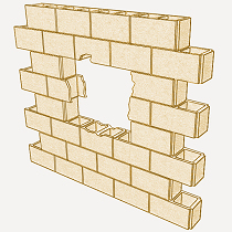 Ouverture d'une baie dans un mur en maçonnerie de blocs creux en béton, avec moyens manuels, sans affecter la stabilité du mur, et chargement manuel dans le camion ou la benne. | ||