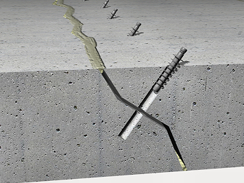 Mise en place des injecteurs internes en polyéthylène, dans un fissure d'élément en béton, dans des trous de entre 6 et 25 mm de diamètre, sécants au plan de la fissure, réalisés en quinconce tous les 20 cm, et le rebouchage superficiel de la fissure avec adhésif thixotropique à deux composants à base de résine époxy, afin d'éviter la fuite du lait pendant le processus d'injection.
