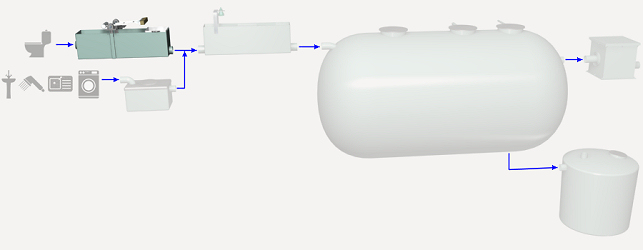Regard dégrilleur en polyester renforcé de fibre de verre (PRFV), de 950x595x475 mm, avec bouche d'entrée et bouche de sortie, de 110 mm de diamètre, couvercle, grille de matières volumineuses, panier extractible et râteau, pour prétraitement des eaux usées.